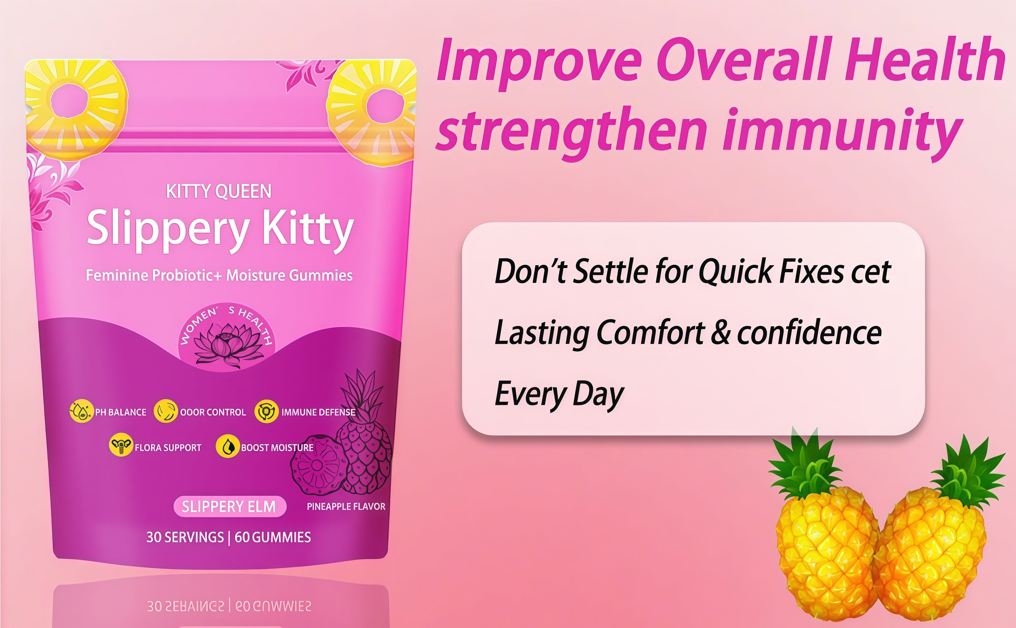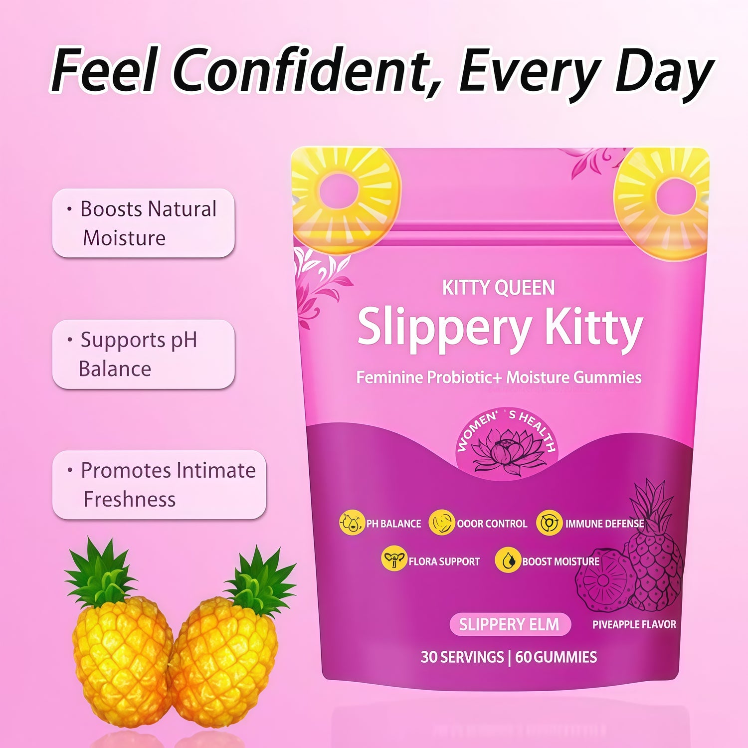 Meet Slippery Kitty™ Feminine Probiotic + Moisture Gummies — your new self-care essential for inner freshness and confidence. Each delicious pineapple-flavored gummy delivers powerful probiotic and moisture support to keep your microbiome balanced, odor-free, and thriving.